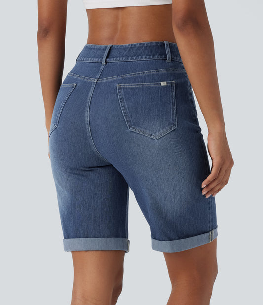 High Waisted Pockets Rolled Hem Washed Denim Casual Bermuda Shorts