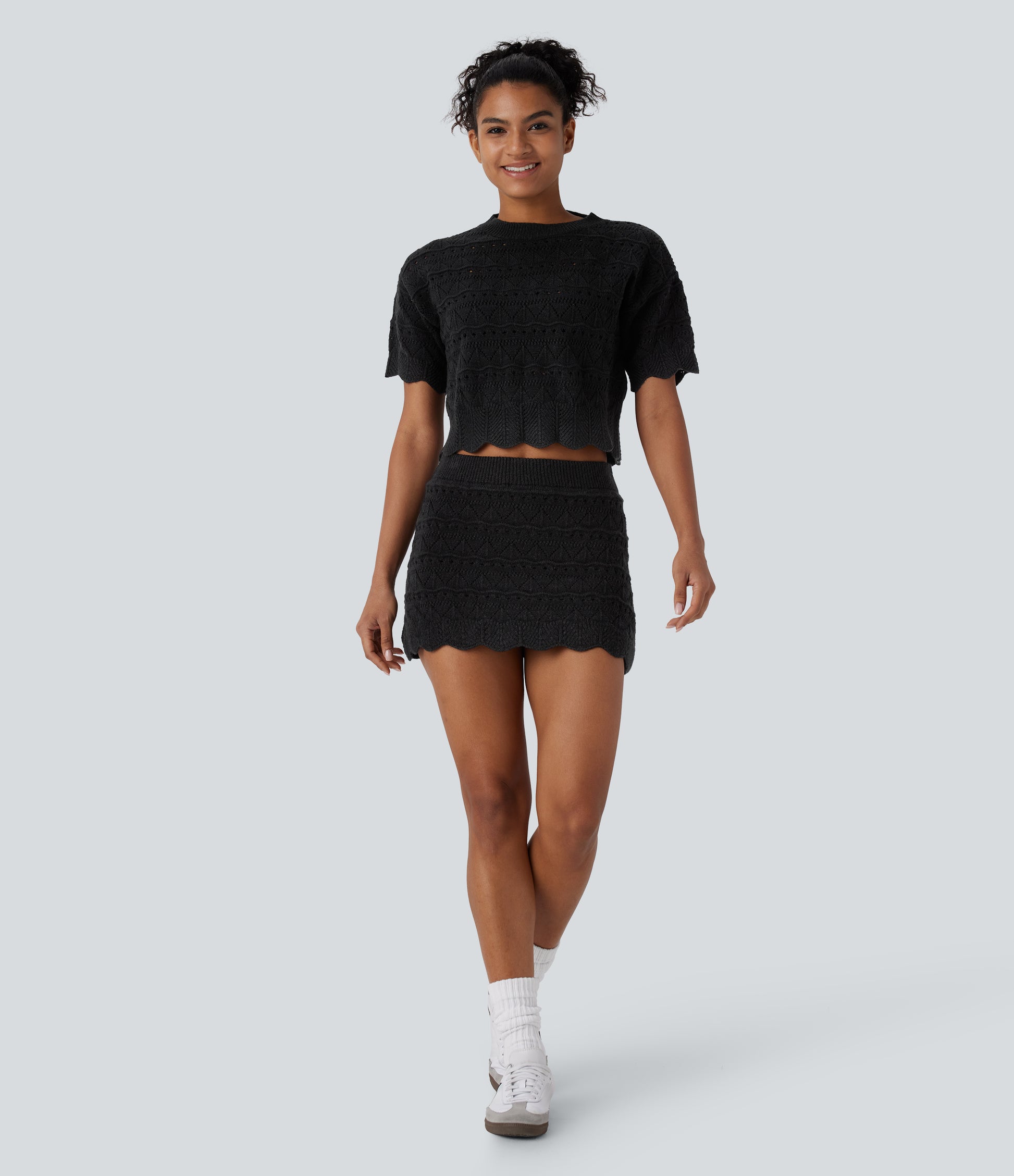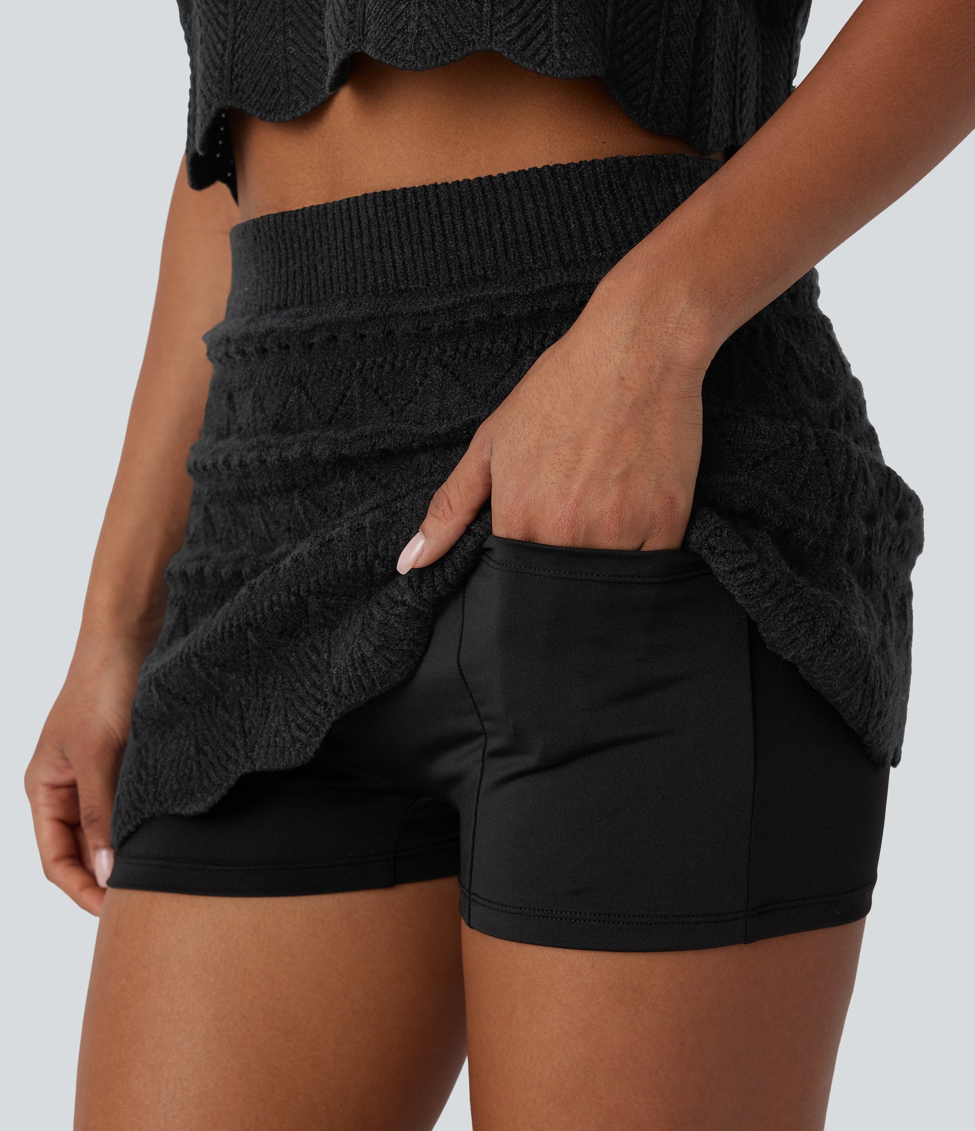 High Waisted 2-in-1 Pocket Open Knit Mini Casual Sweater Skirt