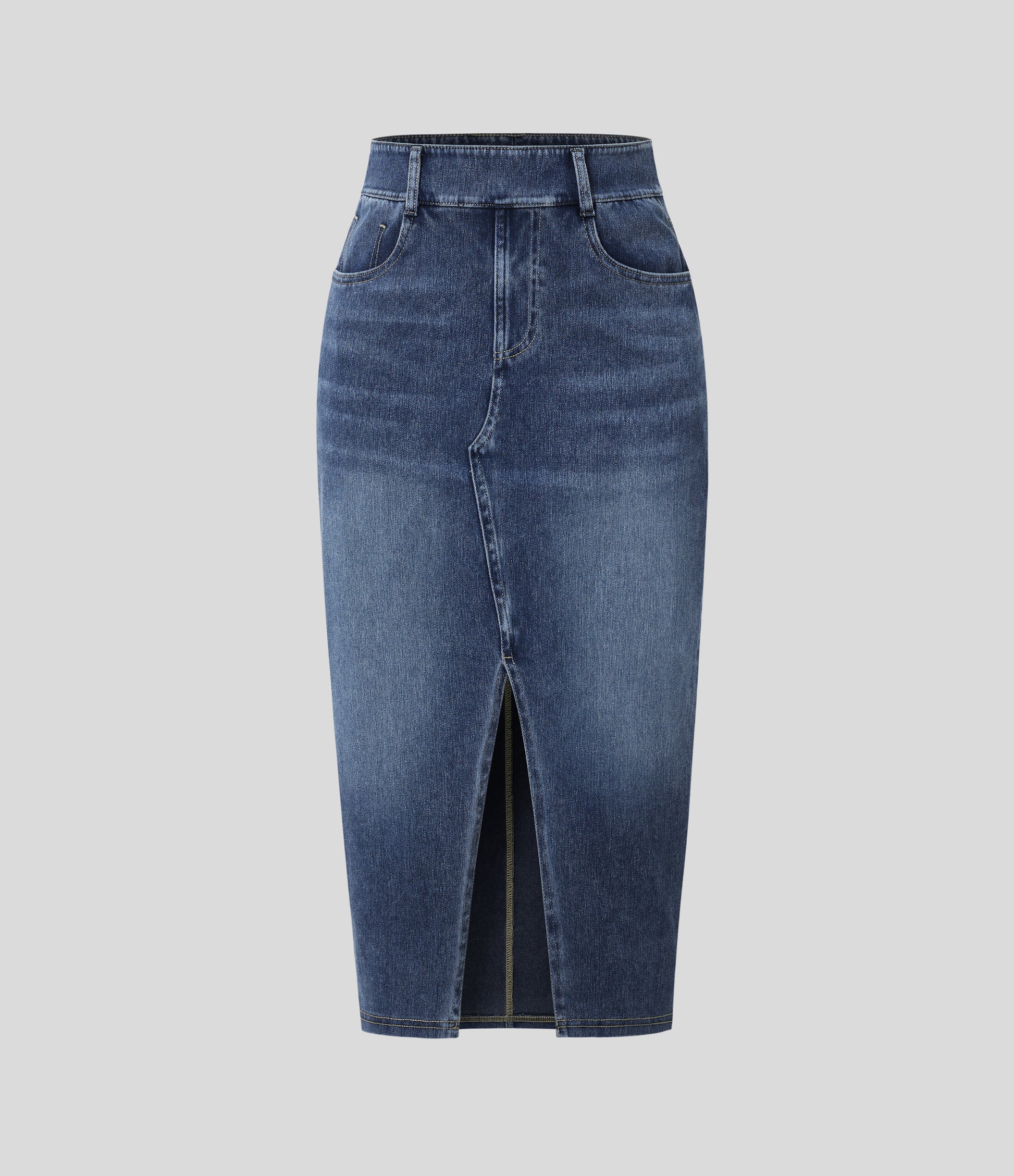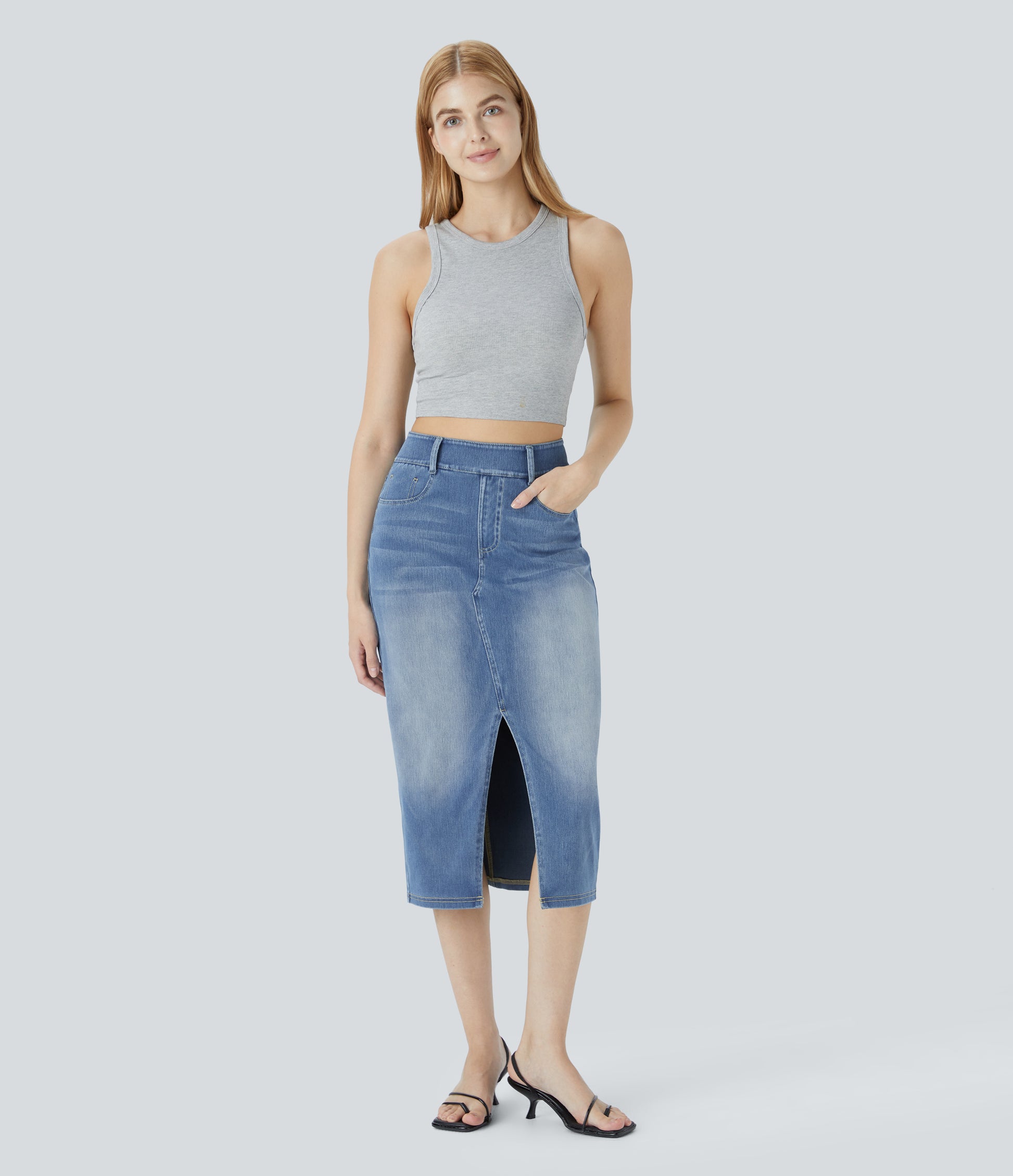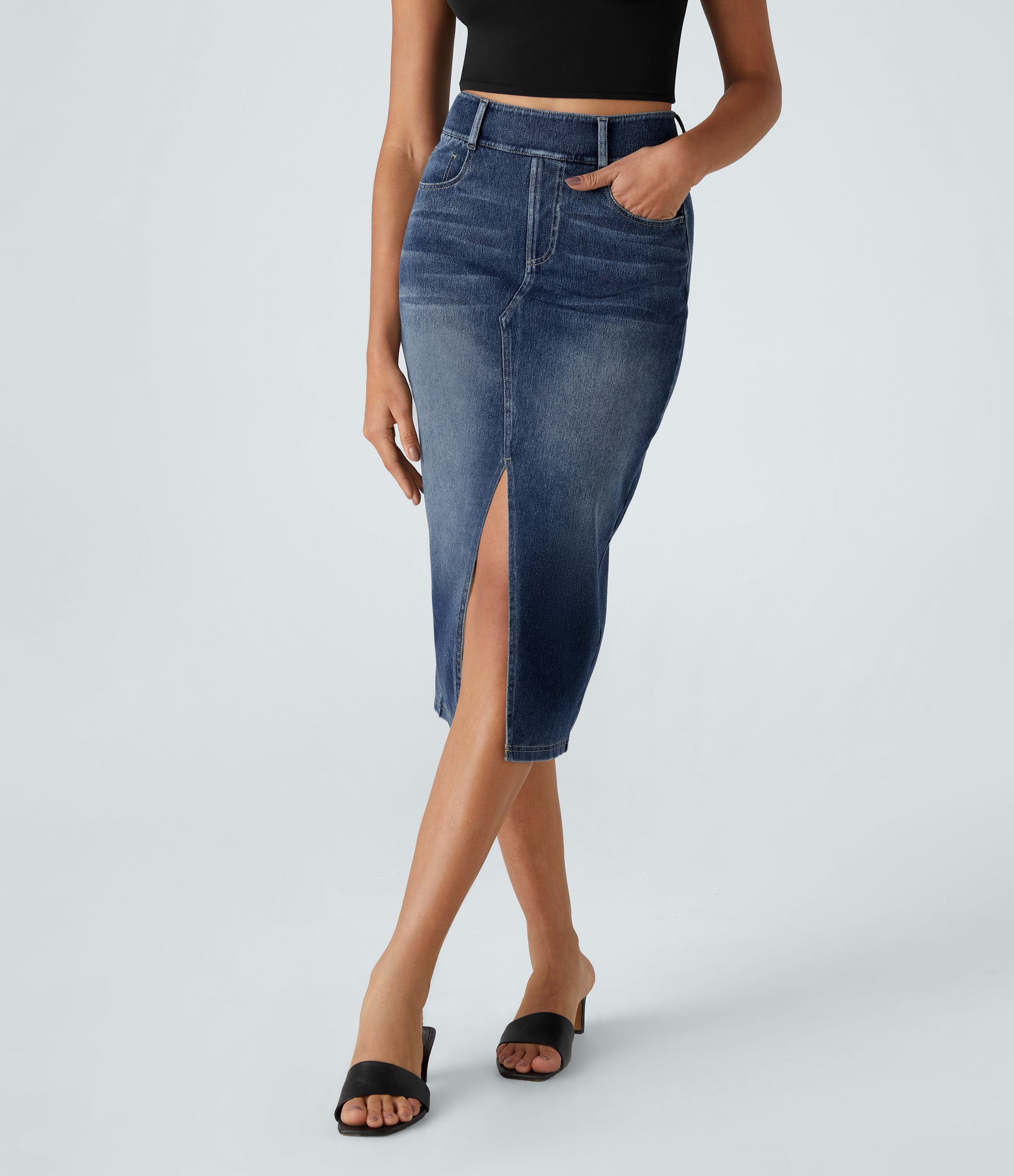 High Waisted Pockets Bodycon Washed Denim Casual Midi Skirt