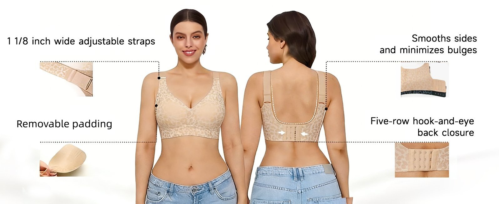 ⏺︎ Four-row back hooks: Fits various body shapes, extends lifespan