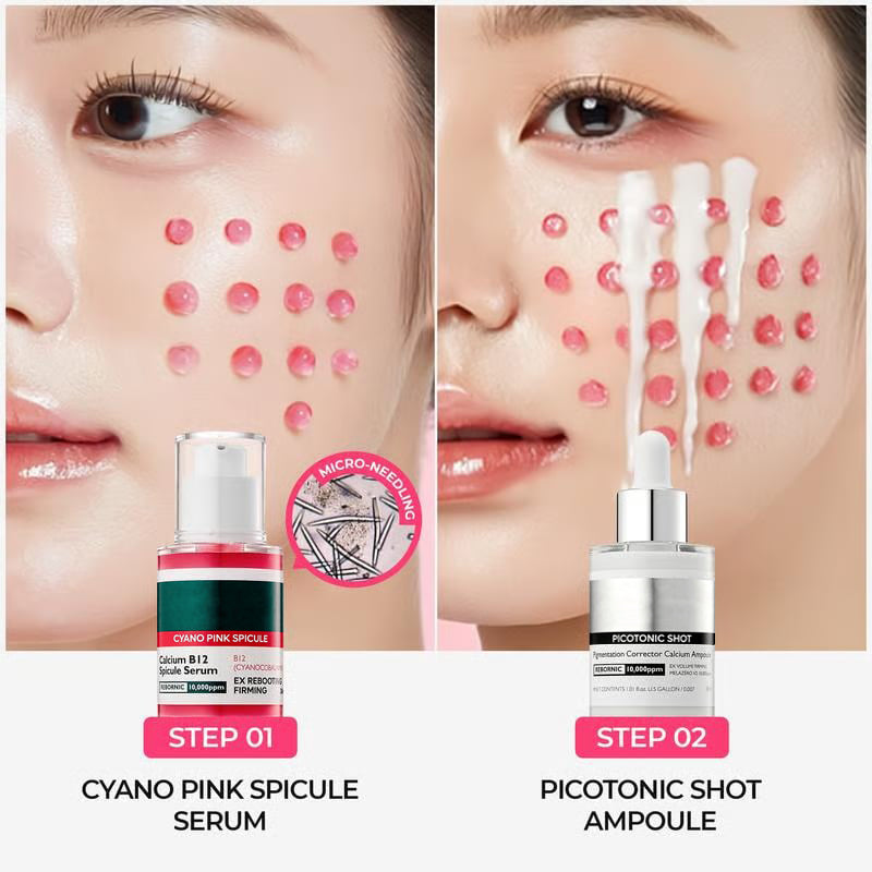 After cleansing, press the Cyano Pink Spicule Serum into pore-prone or blemish areas -Apply the Picotonic Shot Ampoule evenly over the entire face -Finish with cream or sunscreen if needed.